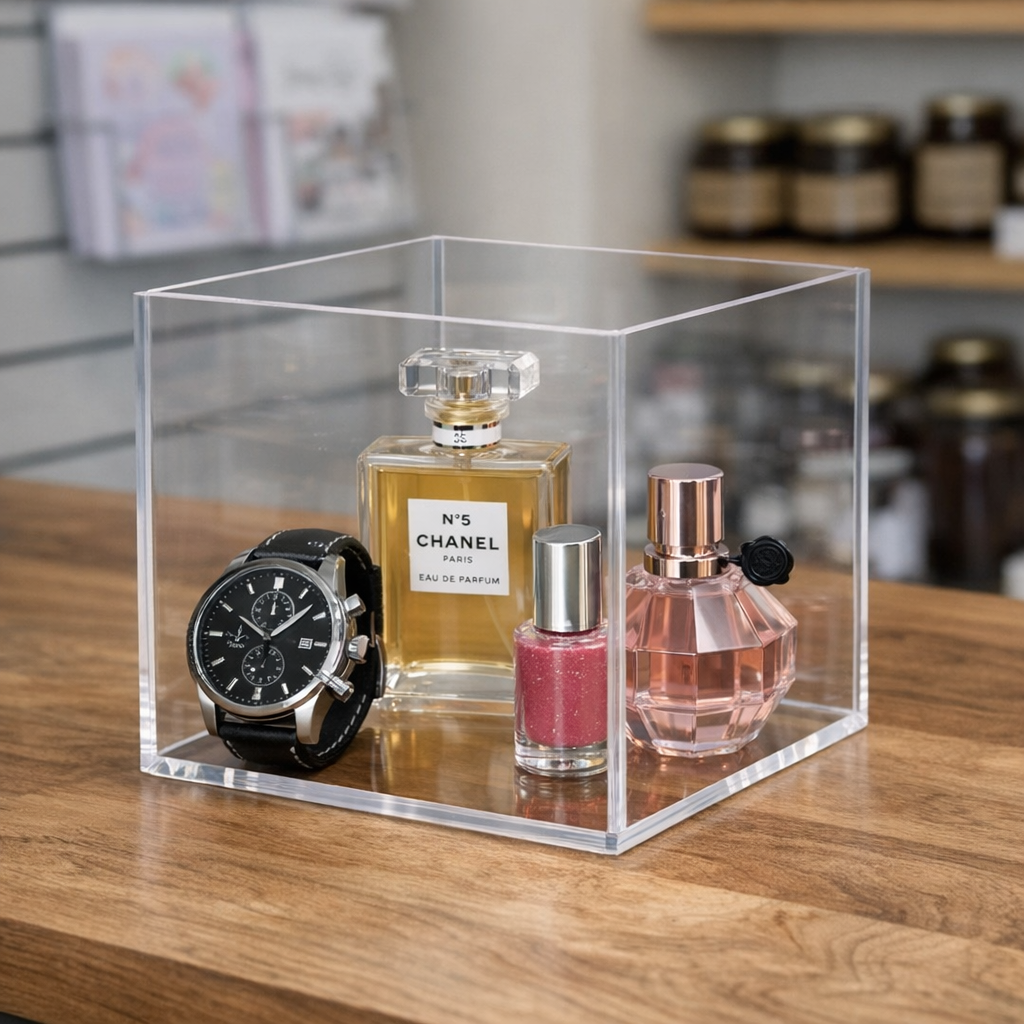 This display cube is manufactured out of 3mm clear Acrylic. The cube is 200mm high by 200mm wide by 200mm deep.