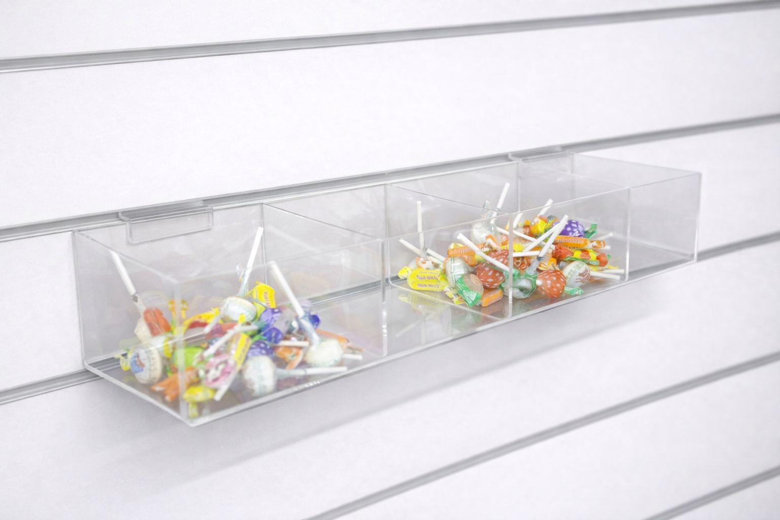 If you are looking for a simple yet stylish way to display your products or organise your slatwall space, our acrylic slatwall 4 compartment trough is the perfect solution. Made from 3mm clear acrylic this 4 compartment tray provides 4 separate compartments to effortlessly showcase various items. Whether you need to to display cosmetics, small accessories or any other merchandise, our slatwall 4 compartment troughs keep everything tidy and easily accessible. Full Width: 600mm. Each Compartment is 100mm high x 150mm deep x 146mm wide