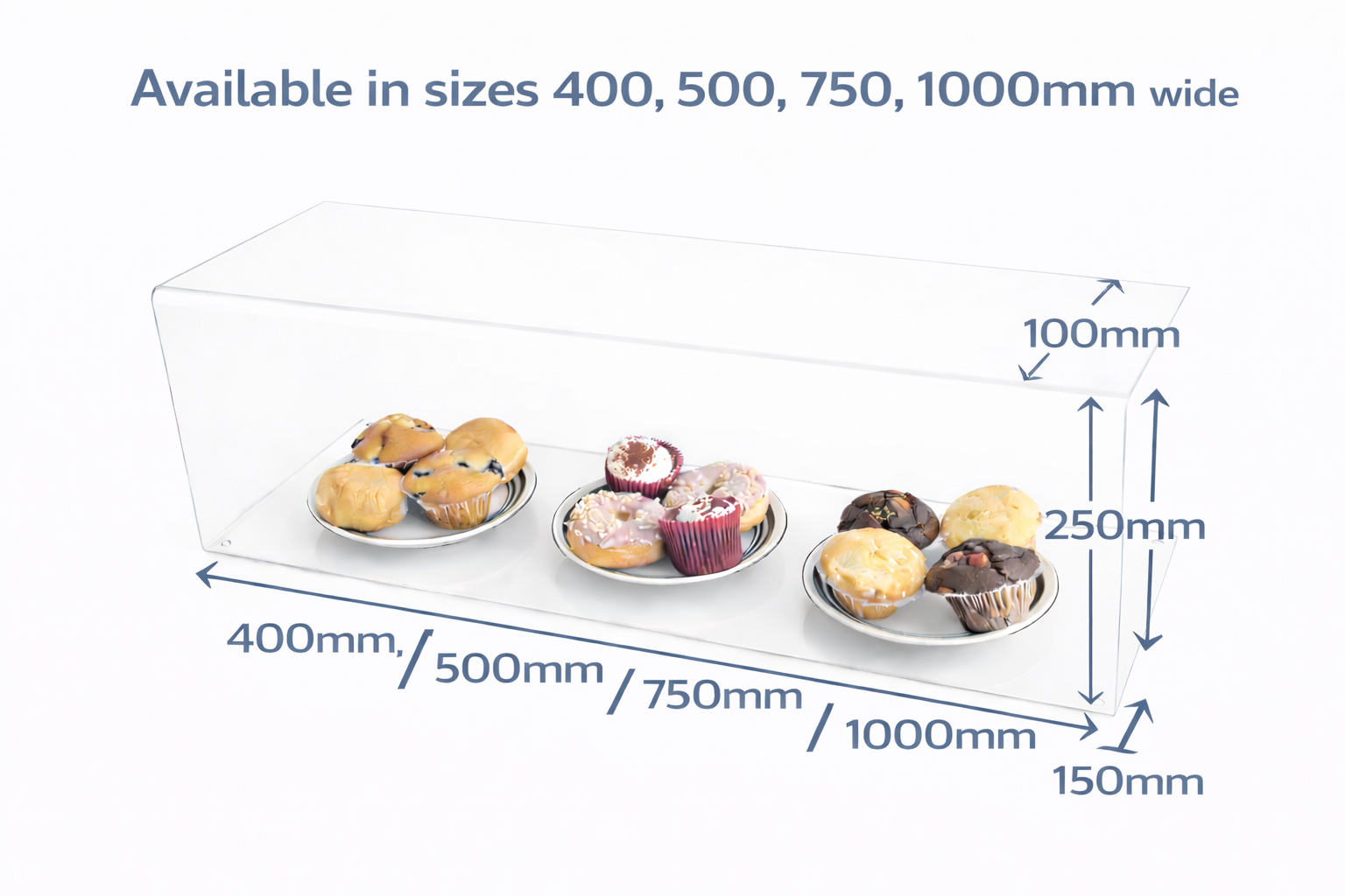 These sneeze guards are manufactured out of 3mm clear acrylic. These are used for hygiene purposes to prevent customers from touching. This sneeze guard is 400 wide x 250mm high with a base of 150mm and a return on top of 100mm.