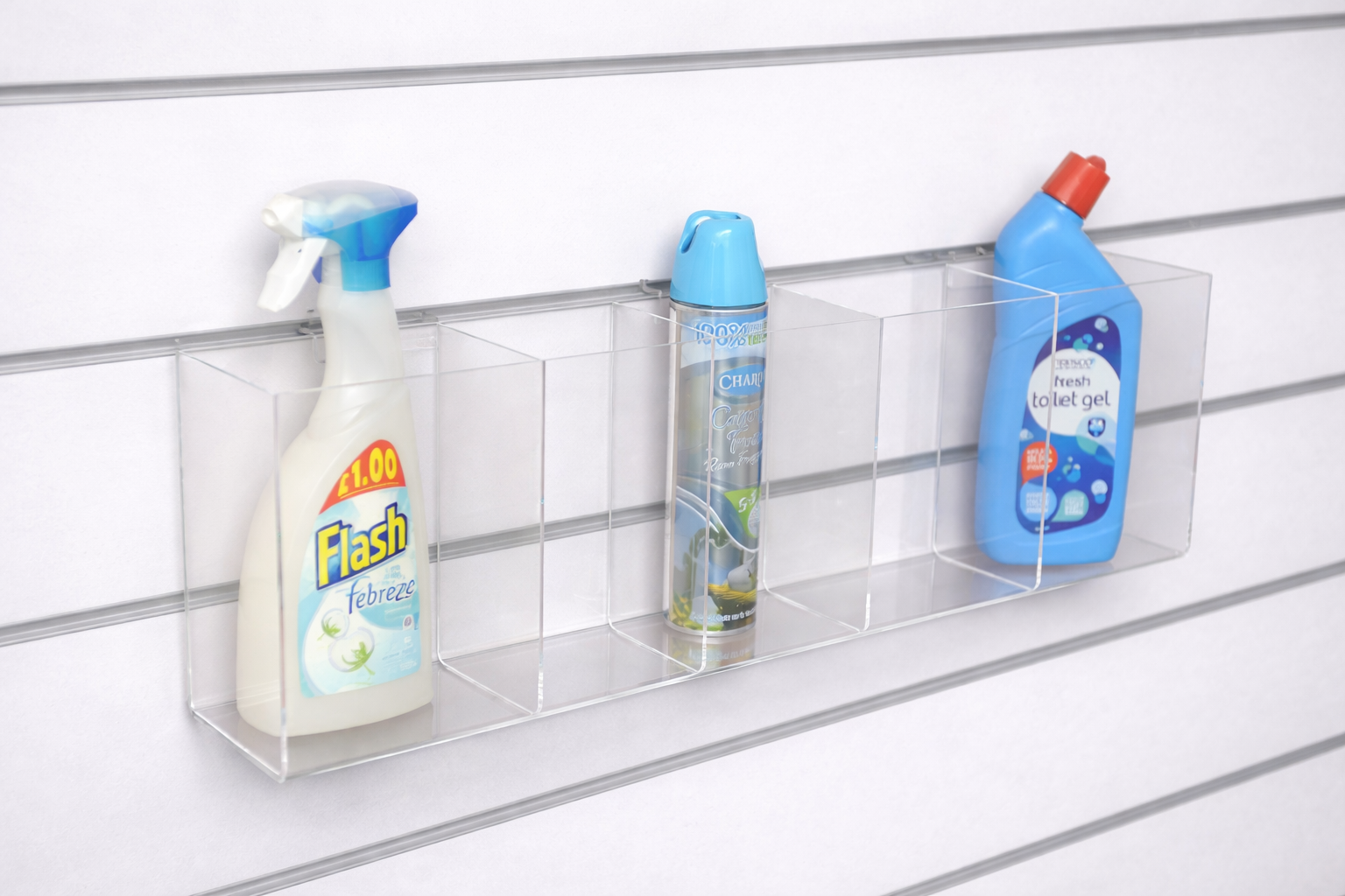 The acrylic slatwall 5 compartment trough is an efficient storage solution for organising and displaying a variety of items. With its sturdy and durable design, this slatwall compartment trough fits to any UK standard slatwall panels maximising your wall space. Its five compartments provide ample room for storing small items such as office supplies, tools or retail merchandise. The transparent front panels offer easy visibility and accessibility to the contents inside making it perfect for your retail store. These slatwall 5 compartment troughs are manufactured out of 3mm clear acrylic. The full Width is 600mm. Each Compartment is 200mm high x 100mm deep x 116mm wide.