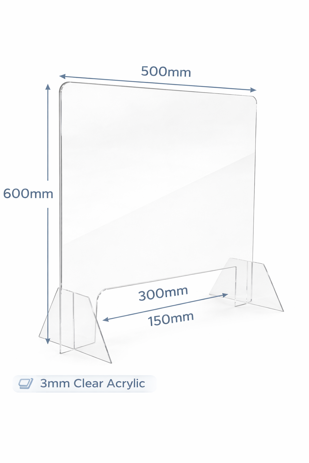 This basic is screen is manufactured out of 3mm clear acrylic. Standing 600mm high x 500mm wide with a cut out of 300mm wide x 150. Ideal for a nail salon.
