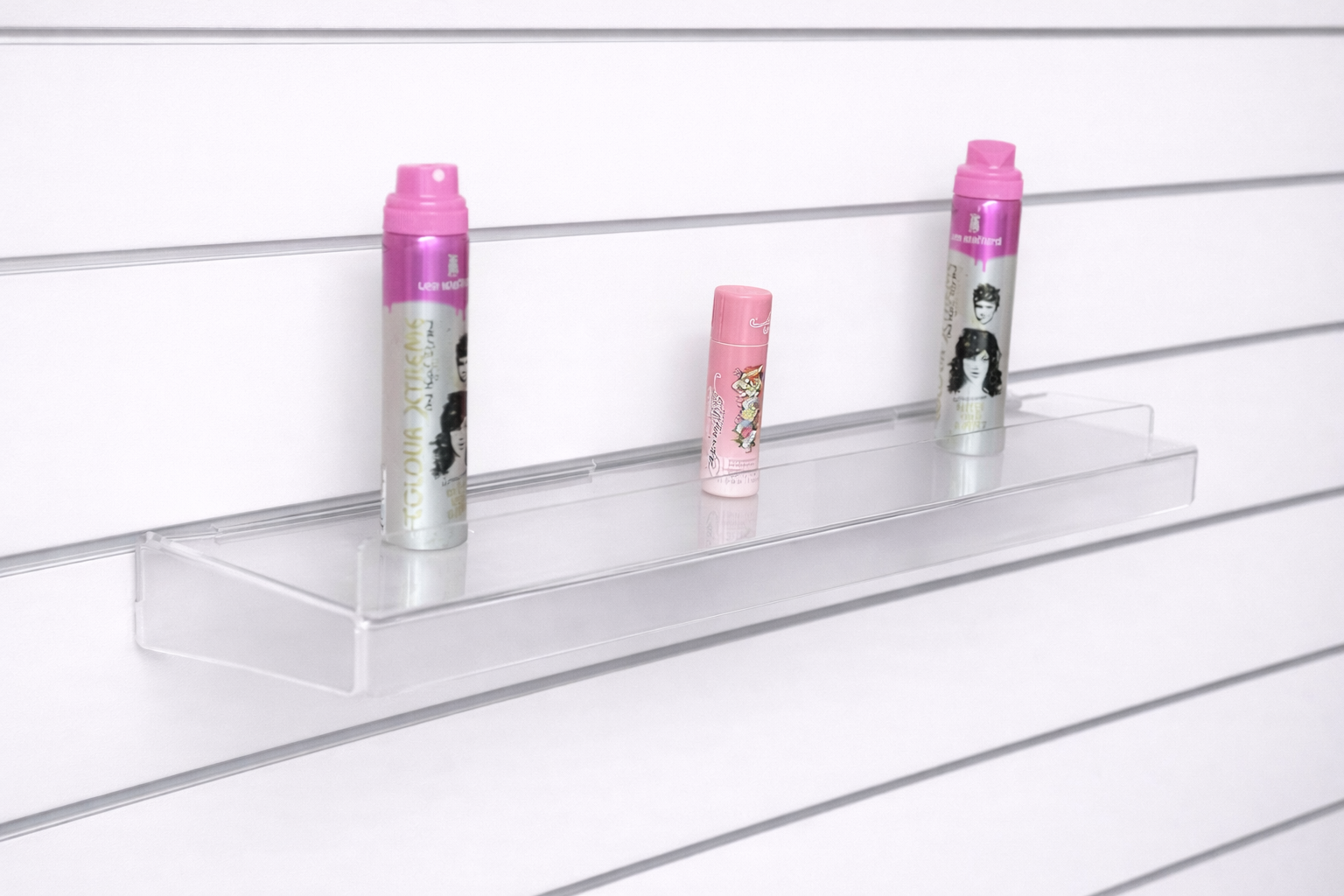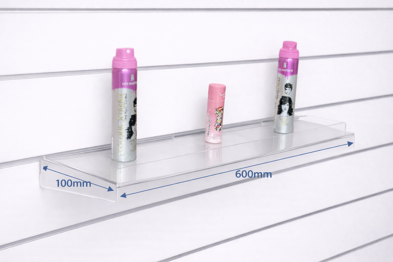 These acrylic front lip shelves are designed to enhance and maximise your retail space. This shelf is a perfect choice for displaying various products in an organised and visually appealing manner. This acrylic front lip shelf is 600mm wide x 100mm deep providing ample space to showcase your merchandise. Manufactured out of 3mm clear acrylic this design of shelf allows your products to take centre stage whilst the front lip prevents products from falling off together with side supports for that extra strength.