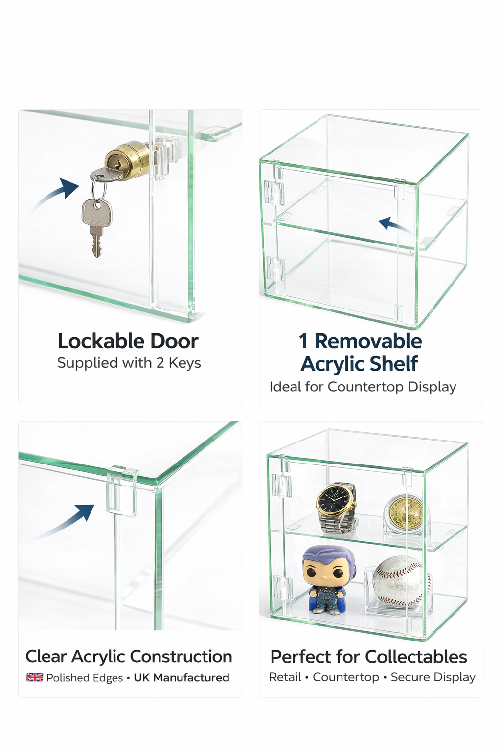 This small lockable display cabinet is manufactured out of 5mm glass effect acrylic. It has 1 removable shelf which sits 150mm from the bottom of the cabinet.