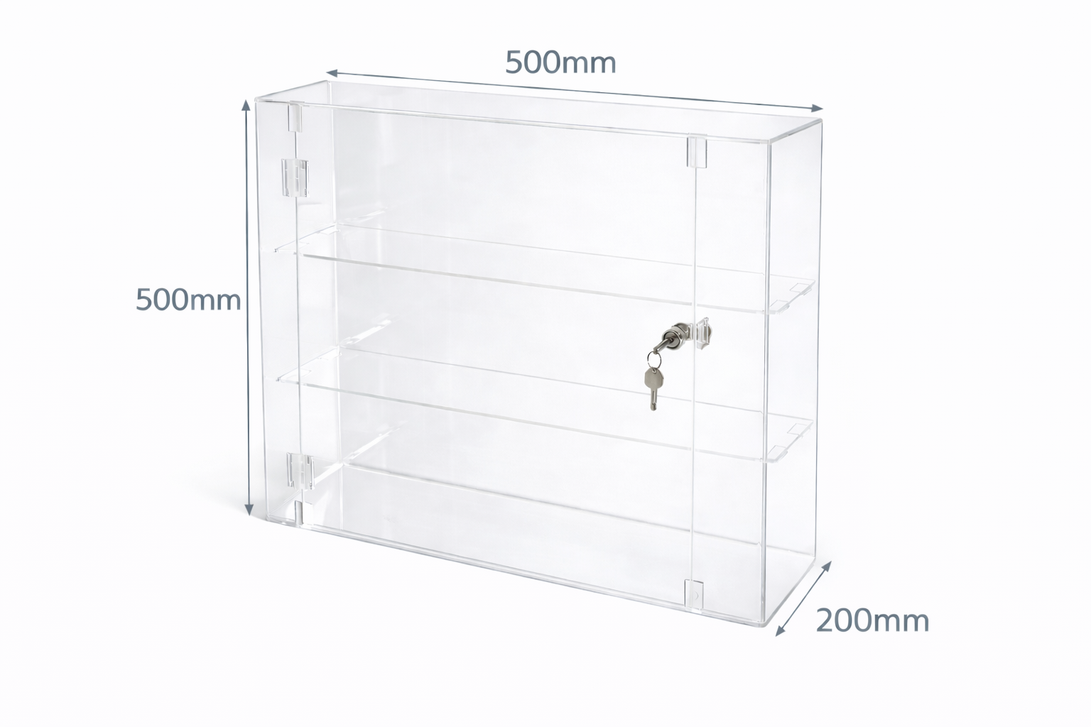 This acrylic lockable display cabinet is manufactured out of 5mm clear acrylic. It has 2 removable shelves with 165mm between each shelf. The cabinet is 500mm High x 500mm wide x 200mm deep.