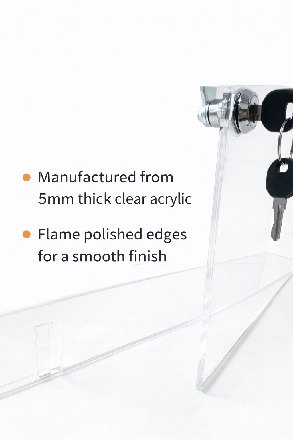 This large acrylic lockable display cabinet is manufactured out of 5mm clear acrylic. It has 3 removable shelves with 185mm between each shelf. It is 750mm High x 500mm wide x 300mm deep. Please note this item needs to be delivered on a pallet due to the size therefore there is an additional delivery charge of £55.