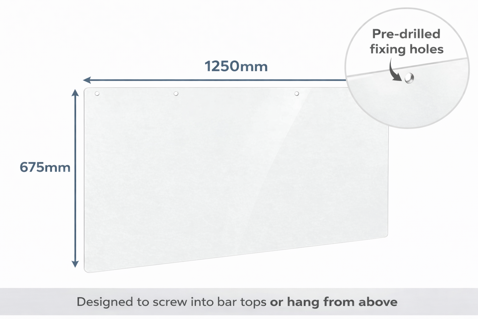 This screen is manufactured out of 1.5mm polycarbonate. 675mm x 1250mm. Comes with screw holes in the top so it can be easily screwed to the top of your bar or alternatively it can be hung.