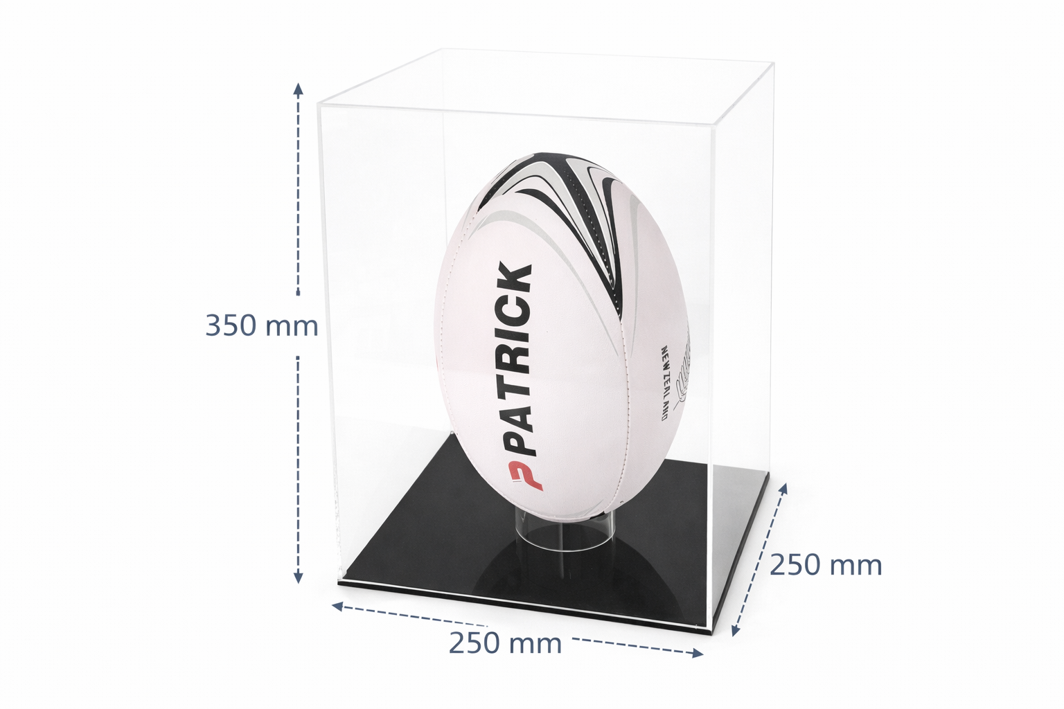 Manufactured out of clear acrylic with a black acrylic base, this Rugby Display Case is 250mm wide x 250mm deep x 355mm high. With polished edges to give that perfect finish. Showcase your prized rugby ball in style with our acrylic rugby ball display case. Manufactured from high quality crystal clear acrylic, this display case is designed to protect and showcase your rugby ball while keeping it safe from dust, dirt and damage. The sleek and modern design will add a touch of elegance to any room or sports memorabilia collection. Whether you are a rugby enthusiast, a dedicated player, or a collector of sports memorabilia, this acrylic rugby ball display case is the perfect way to proudly display and protect your treasured rugby ball.