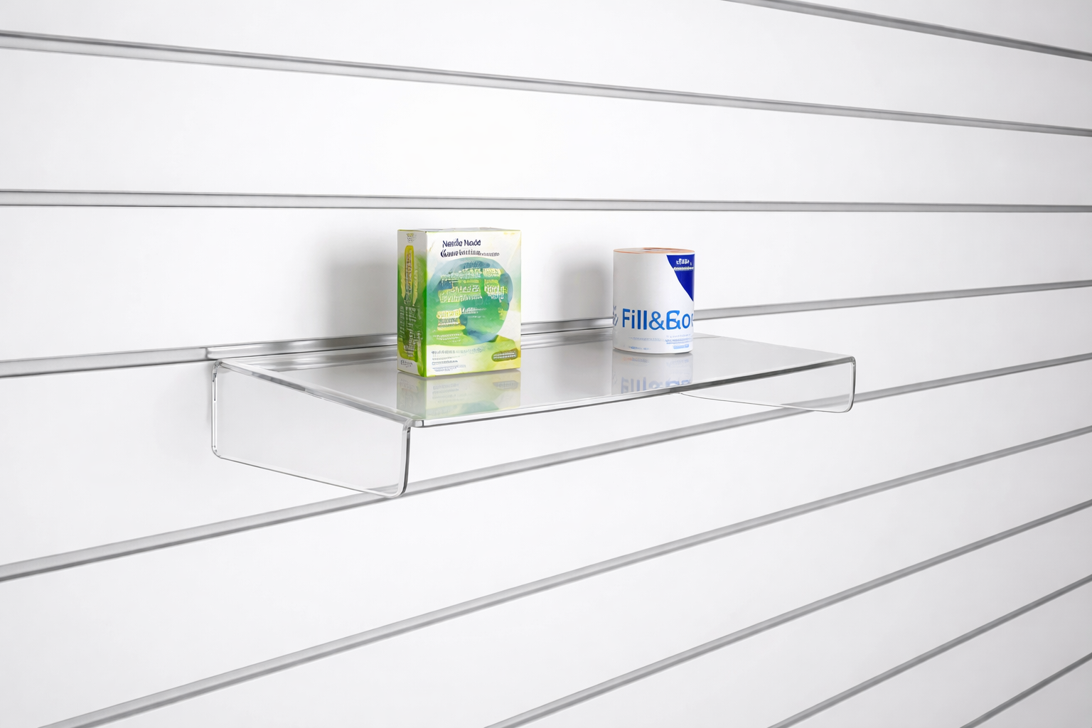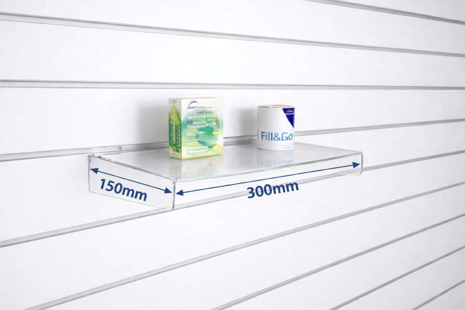 This acrylic slatwall supported shelf is 300mm wide x 150mm deep. Manufactured out of 3mm premium quality clear acrylic this slatwall display shelf is specifically designed to be easily attached to any UK standard slatwall, allowing you to maximise your retail space and showcase a wide range of light weight products with elegance and visibility. These slatwall supported shelves are ideal for various retail settings such as boutiques, stores, supermarkets or exhibitions.